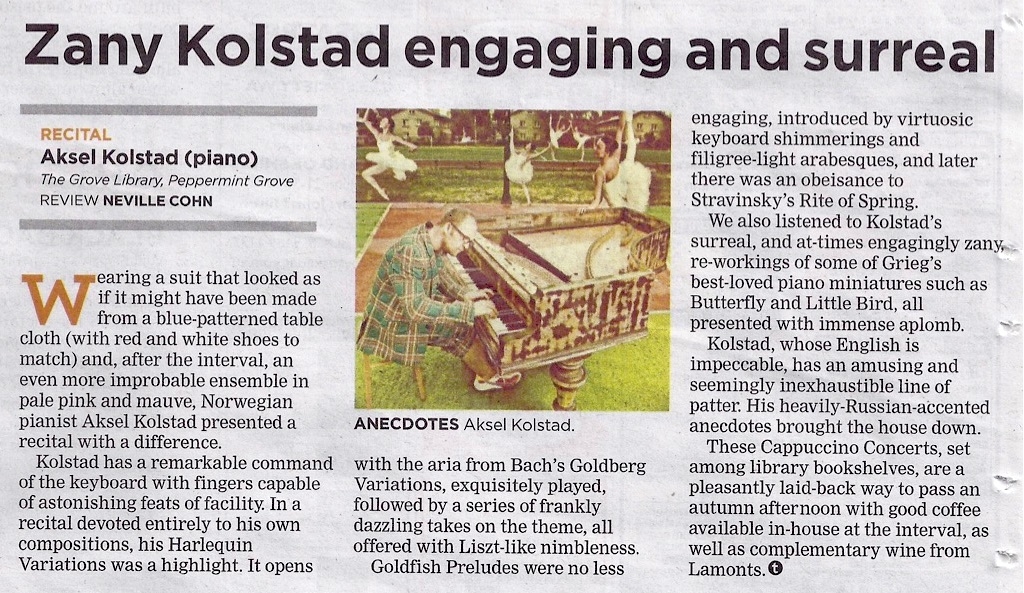 "The Franz Liszt of our time" - Göteborgsposten "Classical pioneer" - Dagsavisen "Kolstad´s Gershwin performances are brilliant" Tønsberg blad "The New Norwegian Victor Borge" - Jeffrey Gurian, comedy writer "Quentin Tarantino of classical music" - Fredrikstad blad "What Aksel does which sometimes amazes the audience the most is that he turns the concert in to a story-telling magical moment."